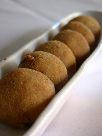 Fizemos uma seleção de tapas quentes. A famosa e boa versão das batatas bravas, aparentemente inspiradas nas de Sergi Arola. Mais uma versão de uma tapa tradicional, o polvo à galega, esta, no entanto, não tão bem sucedida. A batata estava insossa, o polvo também pedia mais de sabor. E puxar os dois juntos no palitinho não era das tarefas mais fáceis, talvez porque a batata estivesse pouco macia.