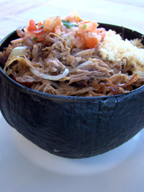 ...ou o irresistível PFino. Feijão, arroz, farofa, vinagrete e carne de sol desfiada devidamente acomodados num coquinho.